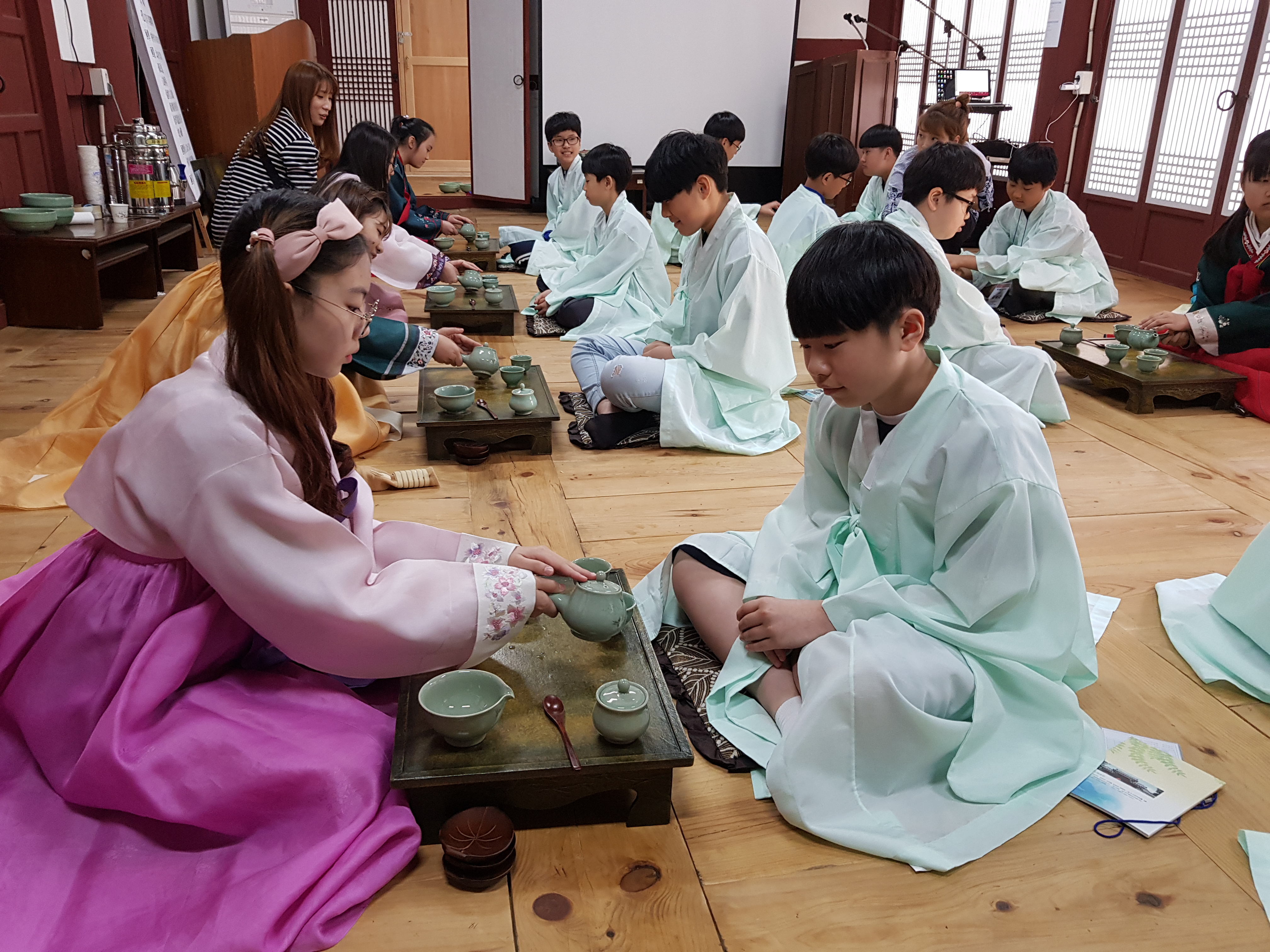 어여쁜 한복을 입고 예절교실과 함께 다도 체험, 천연 화장수 만들기를 진행하였습니다.