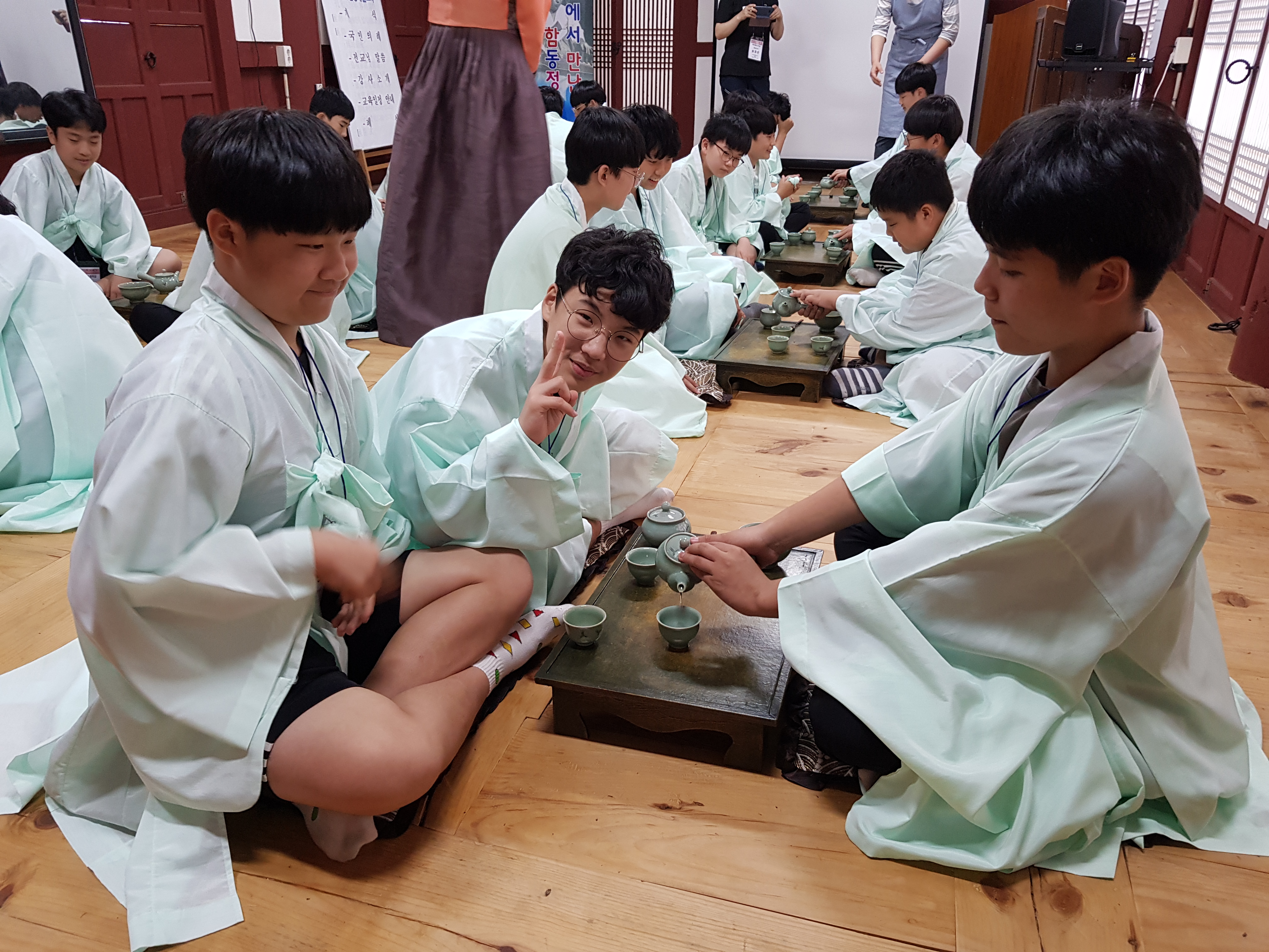 옷을 입으니 친구들이 차분하게 다도를 즐기는 모습입니다.