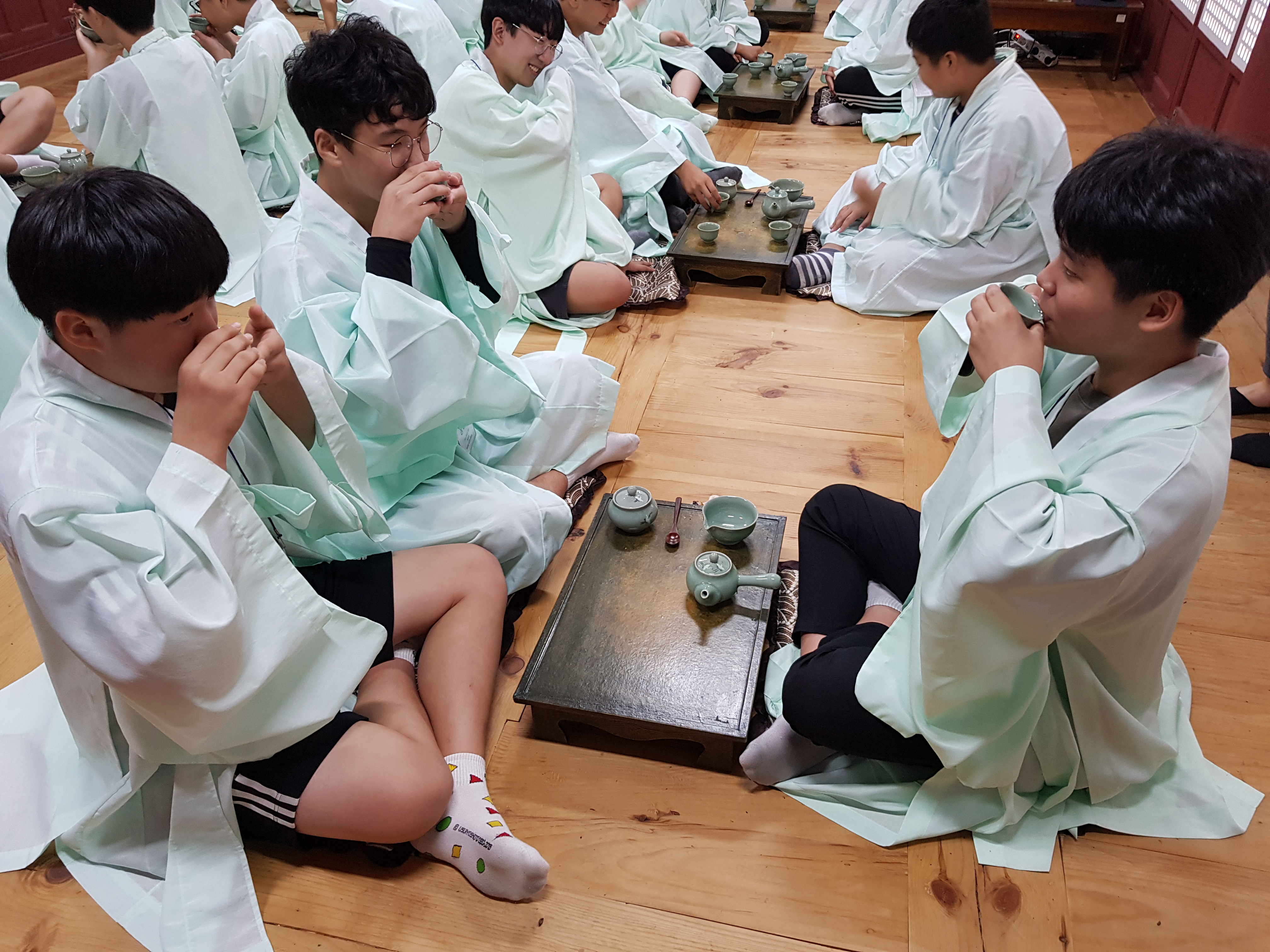 옷을 입으니 친구들이 차분하게 다도를 즐기는 모습입니다.