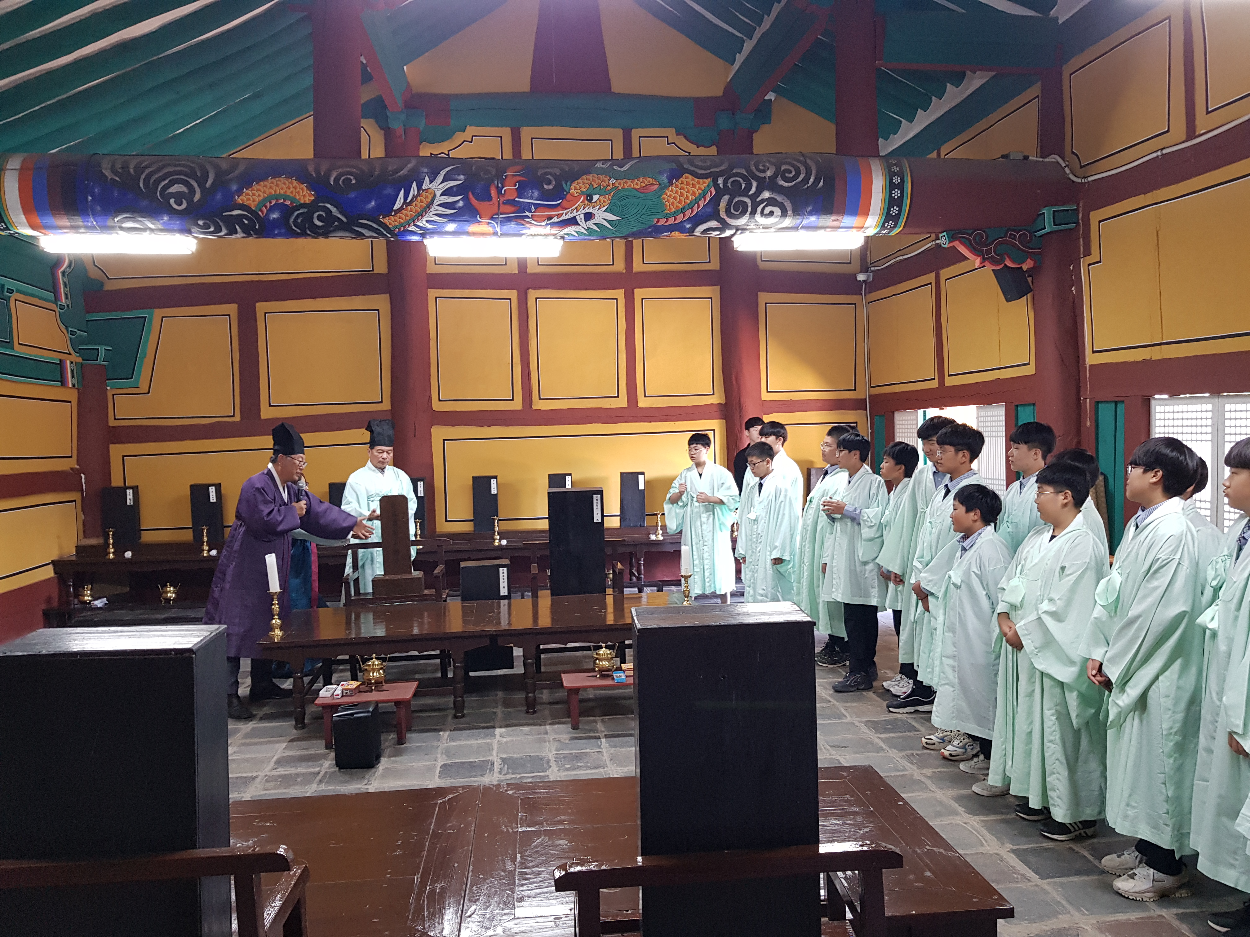 향교 명륜당에서 유생들이 입었던 유복으로 갈아입고 옷고름을 직접 메보고, 전통예절교육을 배워봐요.