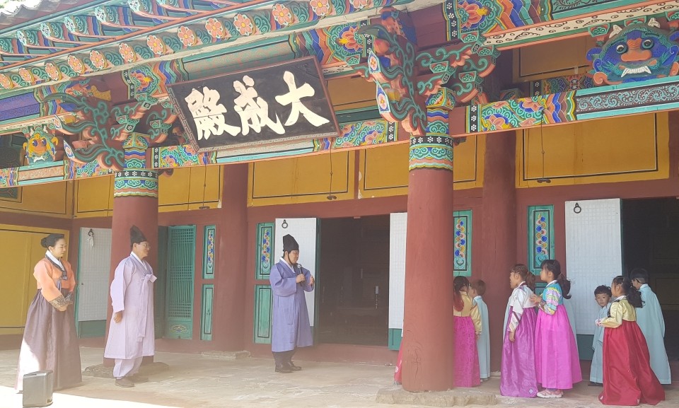 선생님의 소개와 함께 향교 문앞에서 간단한 소개를 들어요