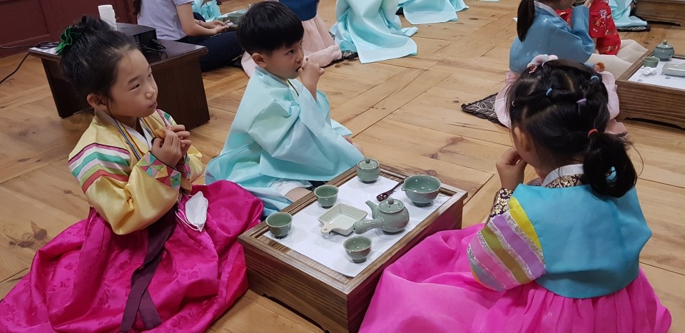첫교시는 <다례수업>을 해봐요. 우리친구들 지난번에 경험했던 기억을 되살려볼까요?