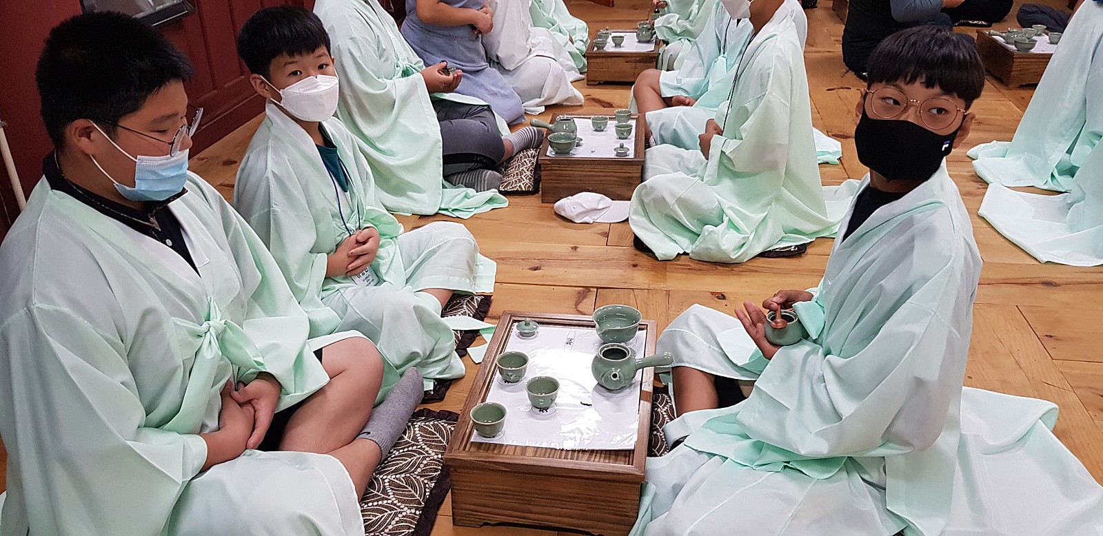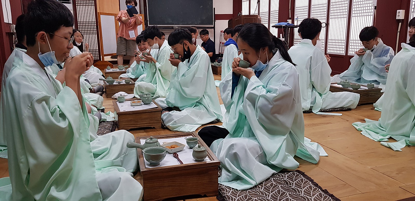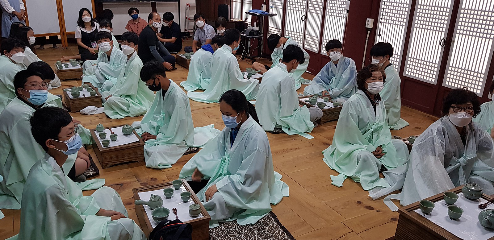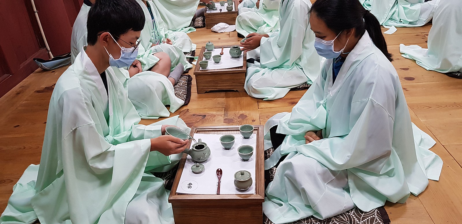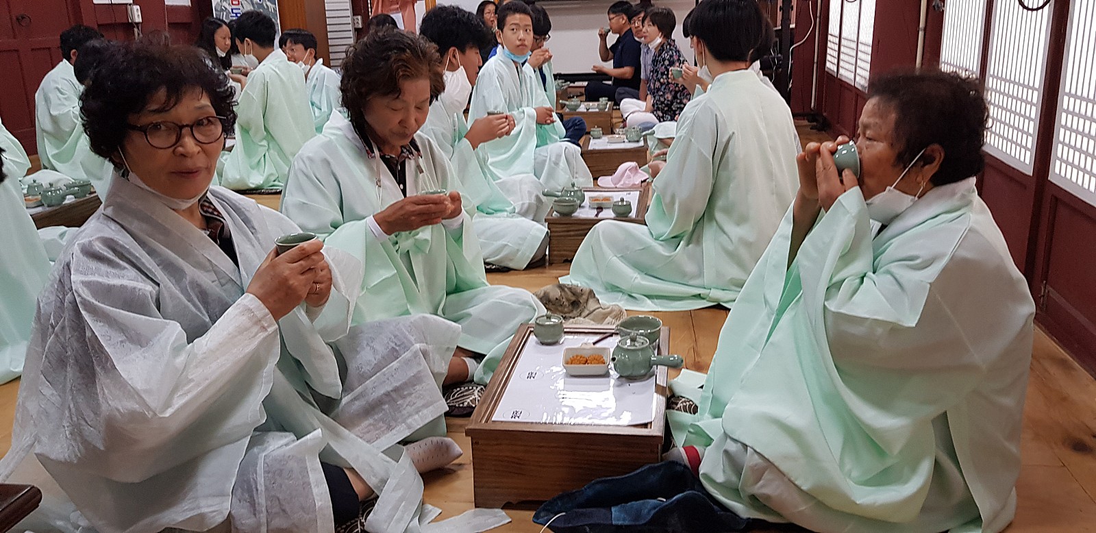 유복으로 갈아입고 다산선생님께서 즐겨드셨다던 다산황차 다례체험을 진행중.