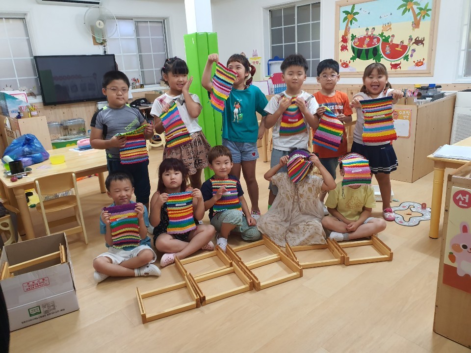 향교에서 못다한 직조를 어린이집에 가지고 가서도 열심히 만들어서 자랑하는 친구들.