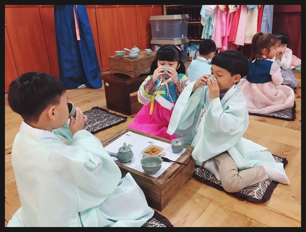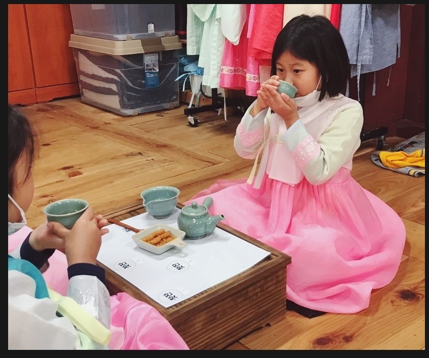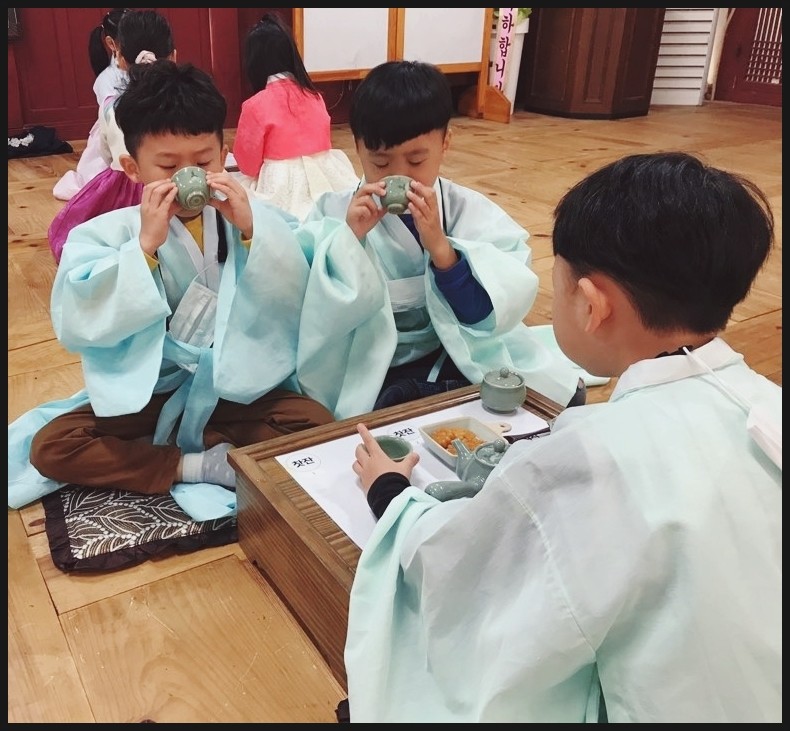 선비복을 입고 다례체험 준비를 하고 있어요 어서 와요~ 새 하늘어린이집 친구들 ㅎㅎ