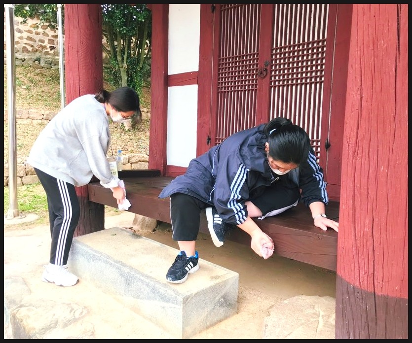 강진고등학교학생들이 방문을 하여 강진향교 동재와 서재를 기름칠이 된 마루를 마른걸레를 이용해서 빛이 나게 닦아주었는데요 얼마나 열심히 닦았던지 마루에 올라가면 미끄러워질 정도였어요 ㅎㅎ