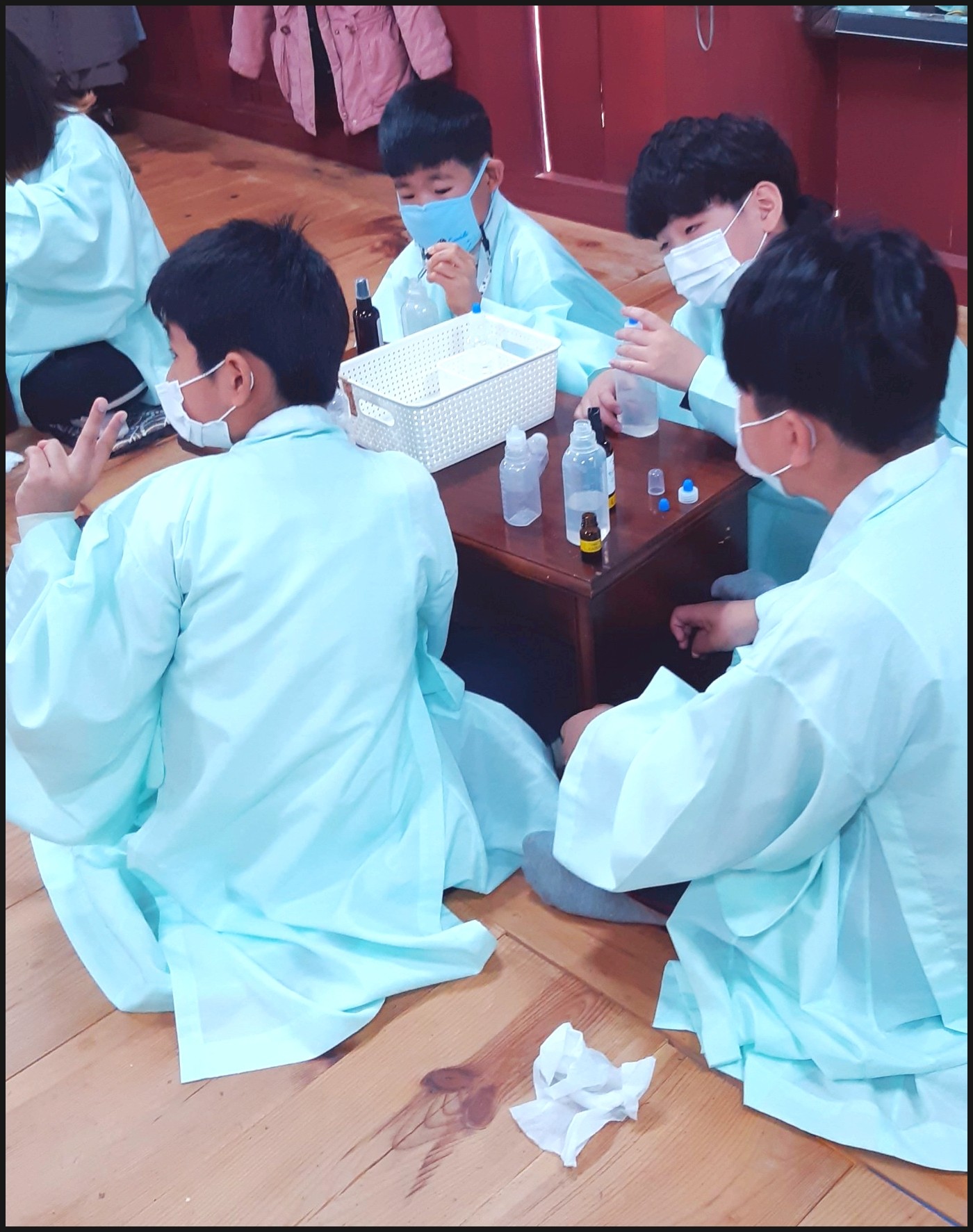 친구들과 함께 유복을 입고서 사진도 찍고 손소독제도 집적 만들어 보았어요.