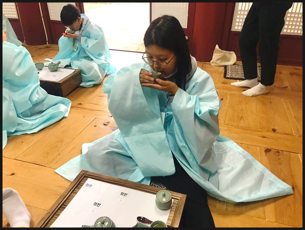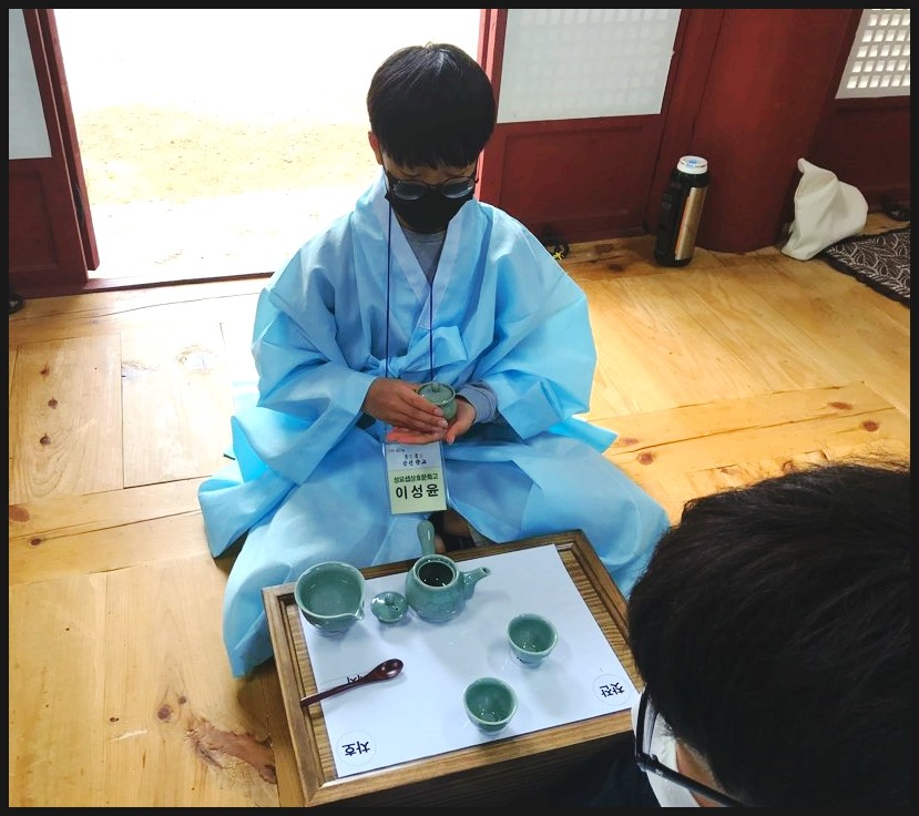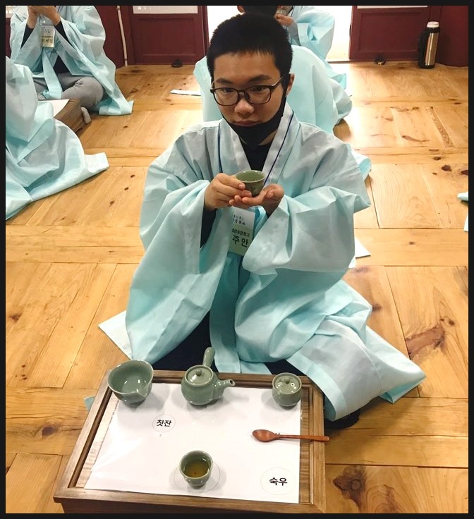 유복을 입고서 다례체험을 진행해요. 유복을 입고서 집중하는 모습이 너무 멋있는데요!