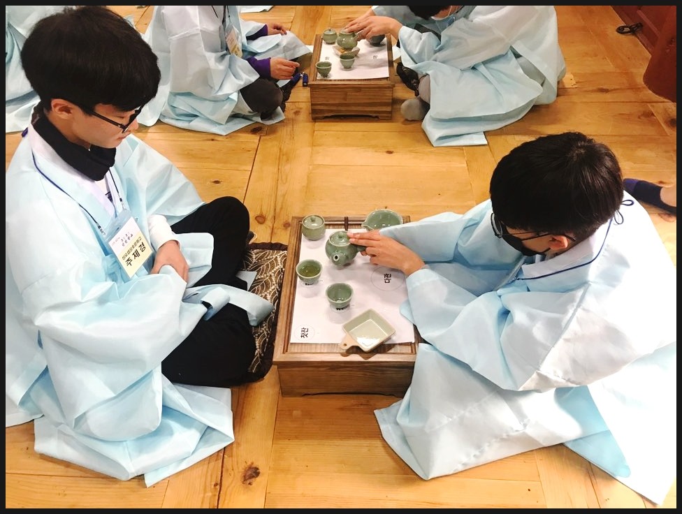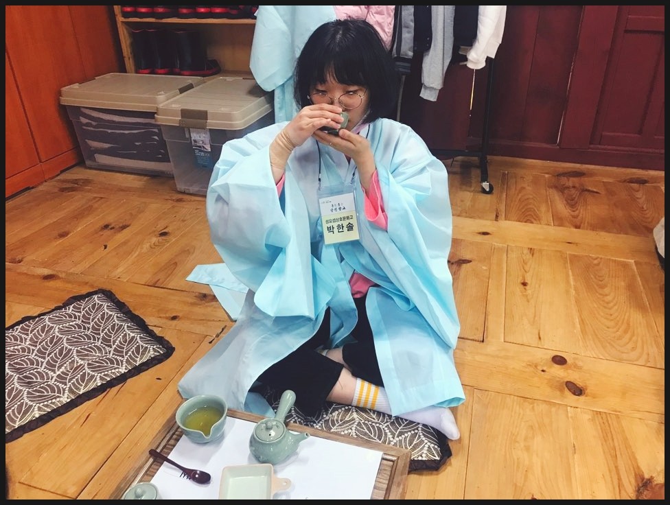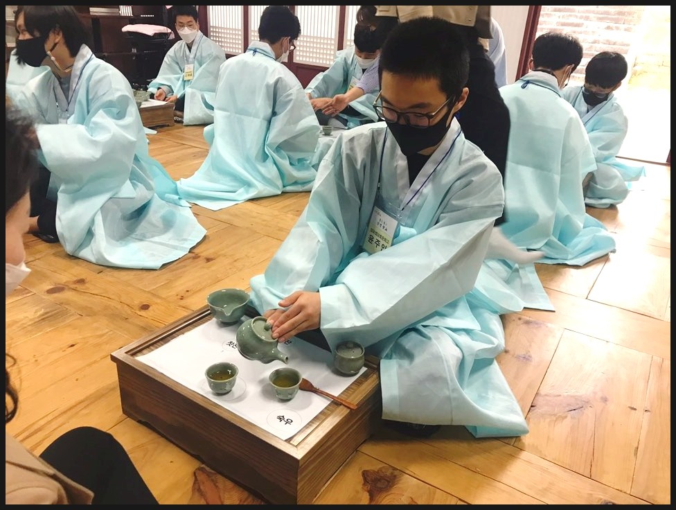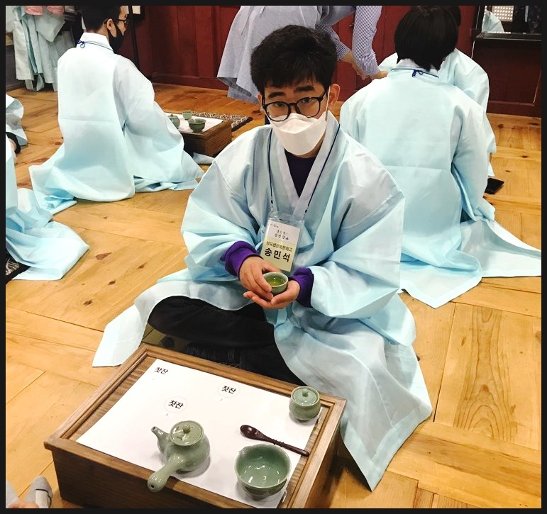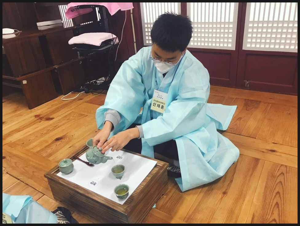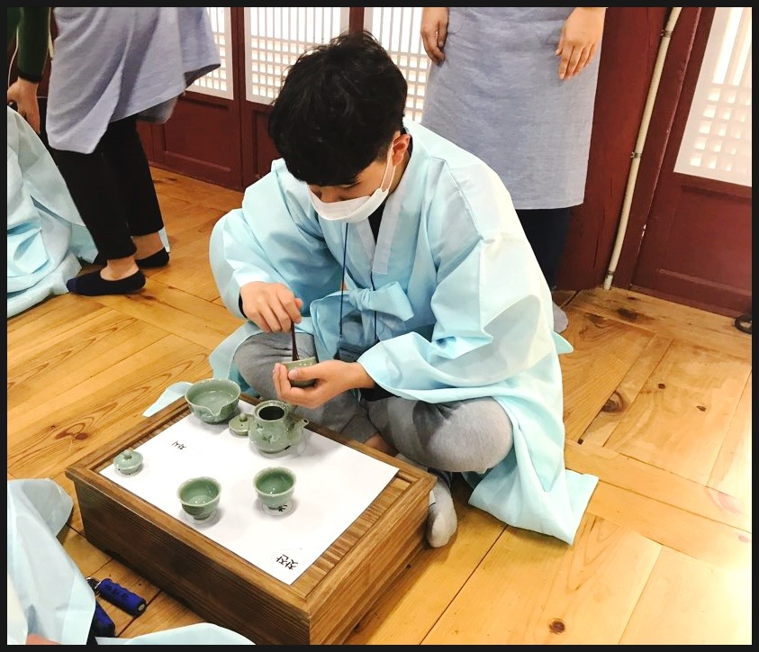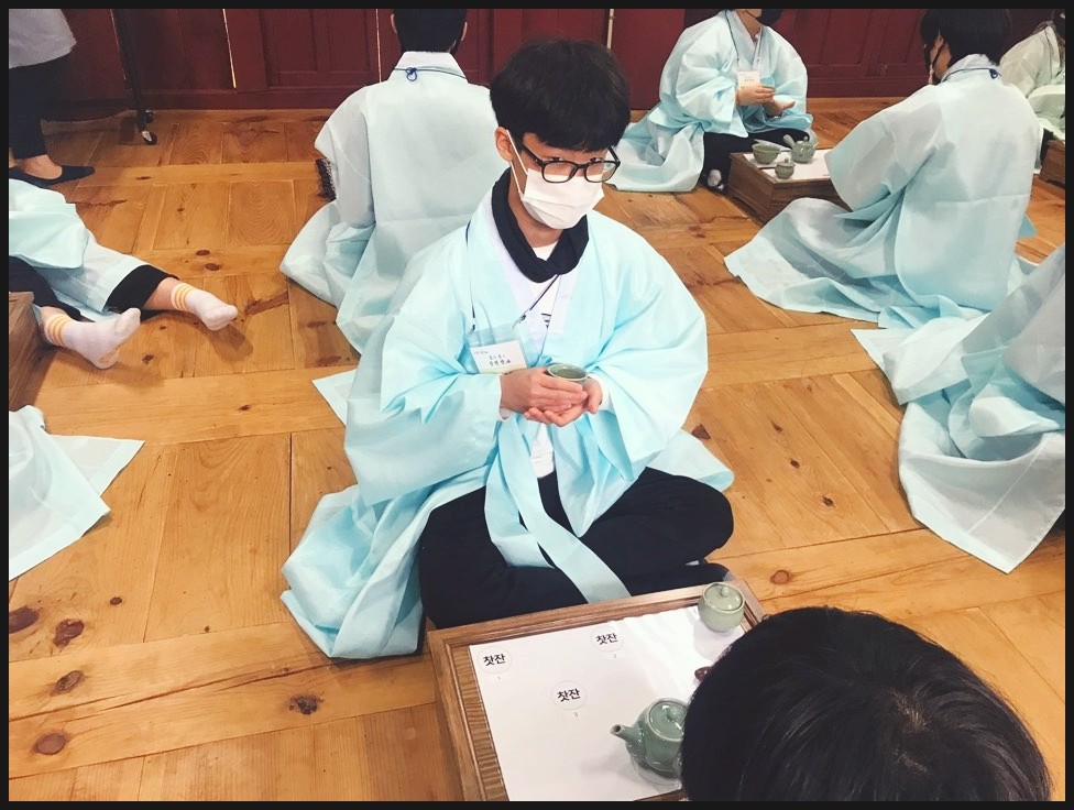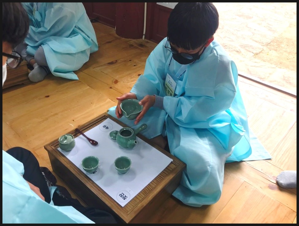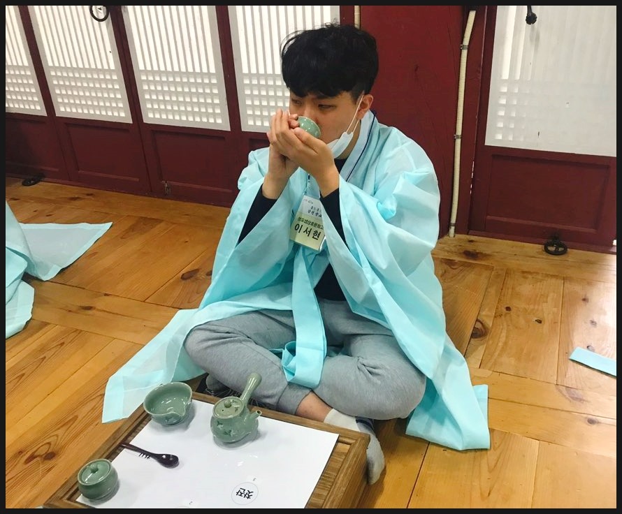 유복을 입고서 다례체험을 진행해요. 유복을 입고서 집중하는 모습이 너무 멋있는데요!