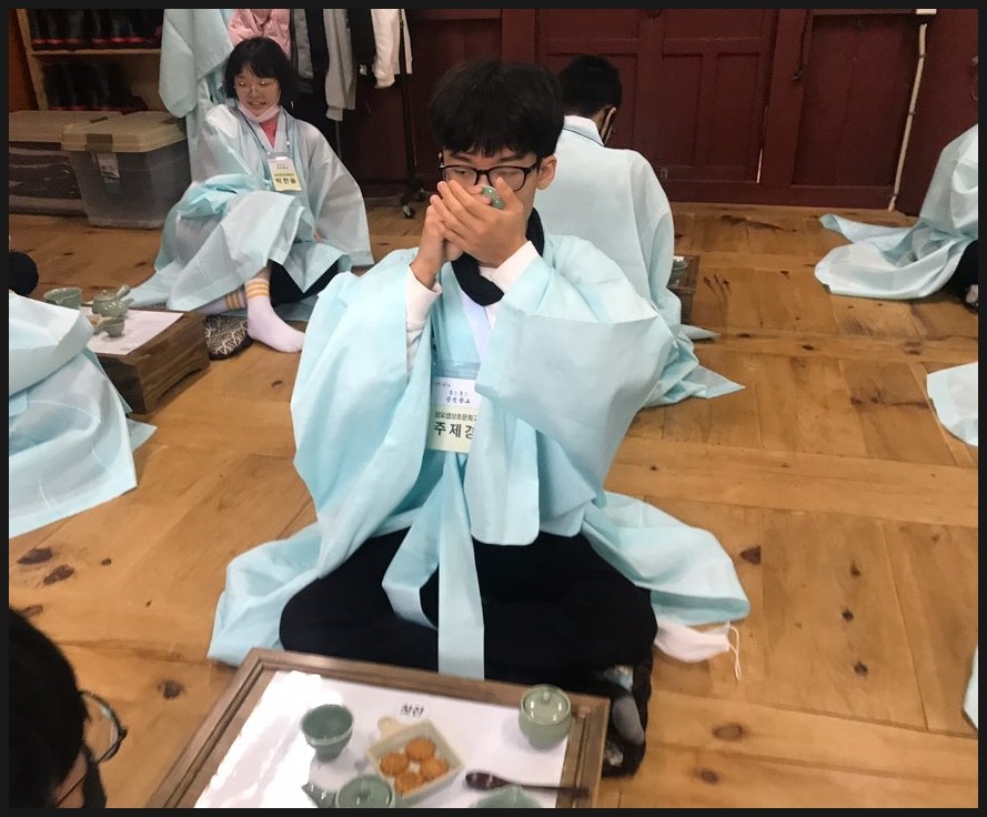 우리 학생들이 처음으로 유복을 입고서 다례체험을 진행하였는데요.