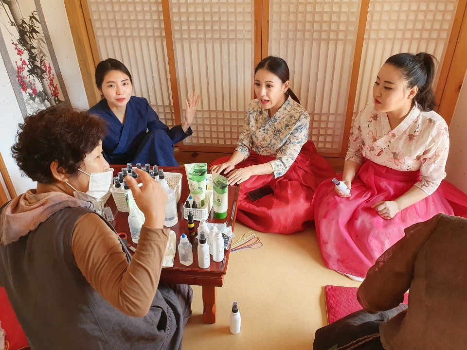 예쁘게 한복을 차려입고서 손 소독제 체험을 진행하였습니다.