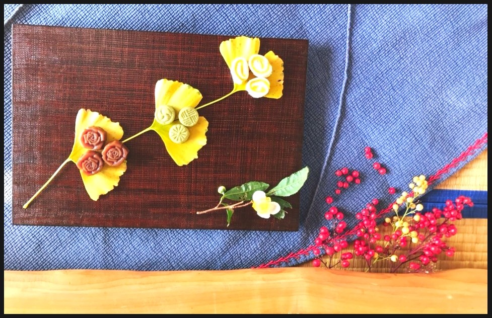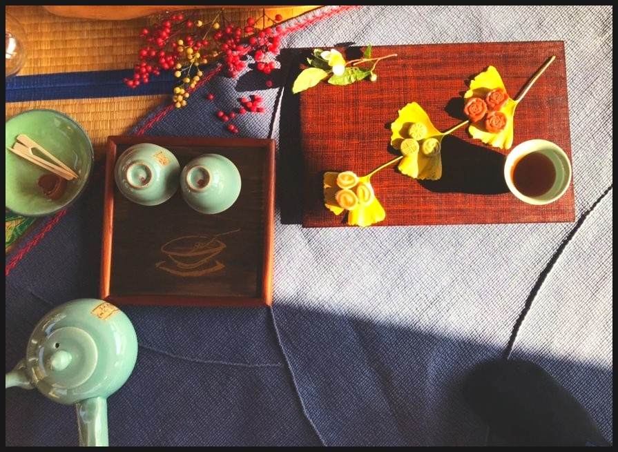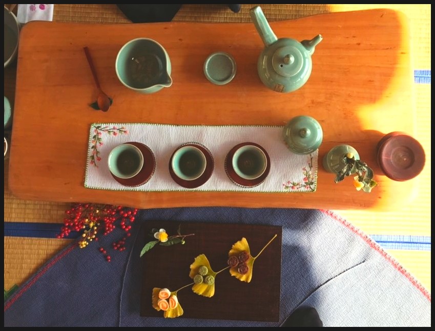 다기세트와 다과입니다. 은행잎으로 장식을했는데요 가을의 냄새가 물씬 풍기는 거 같네요.
