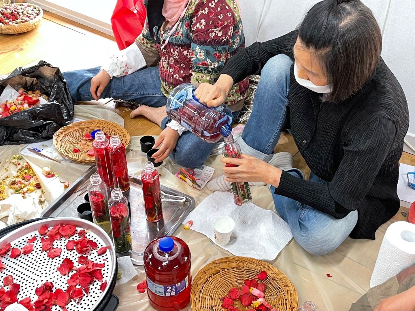 함께 모여 다과를 나누며 꽃차에 대한 이야기도 하고요