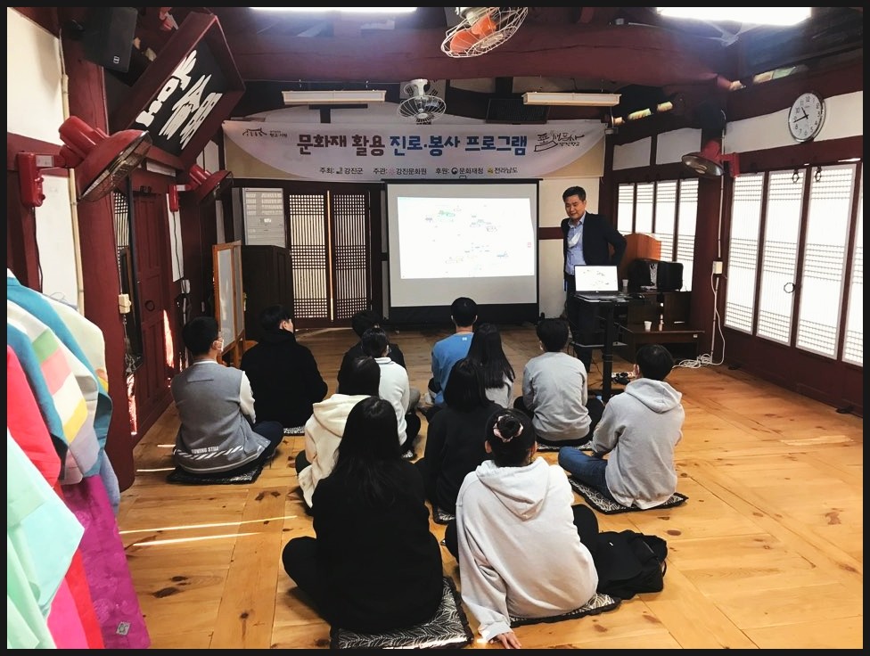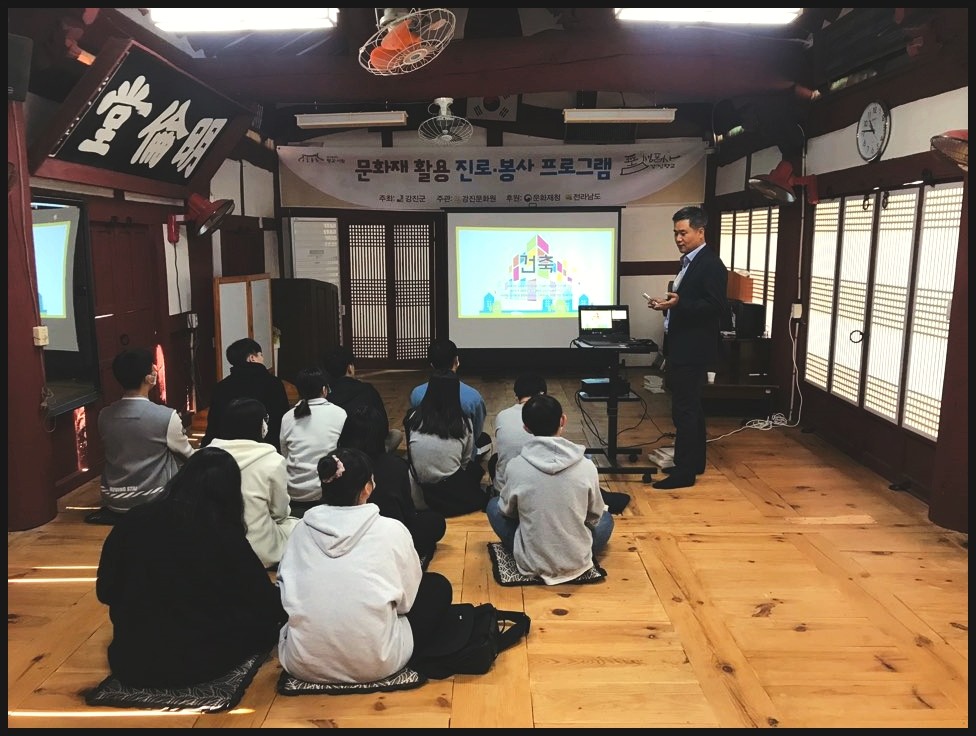 우리 강사님께서 관광도시 강진이야기, 건축의 대한 3요소: 구조, 기능, 미 등 많은걸 가르쳐 주고 있어요.