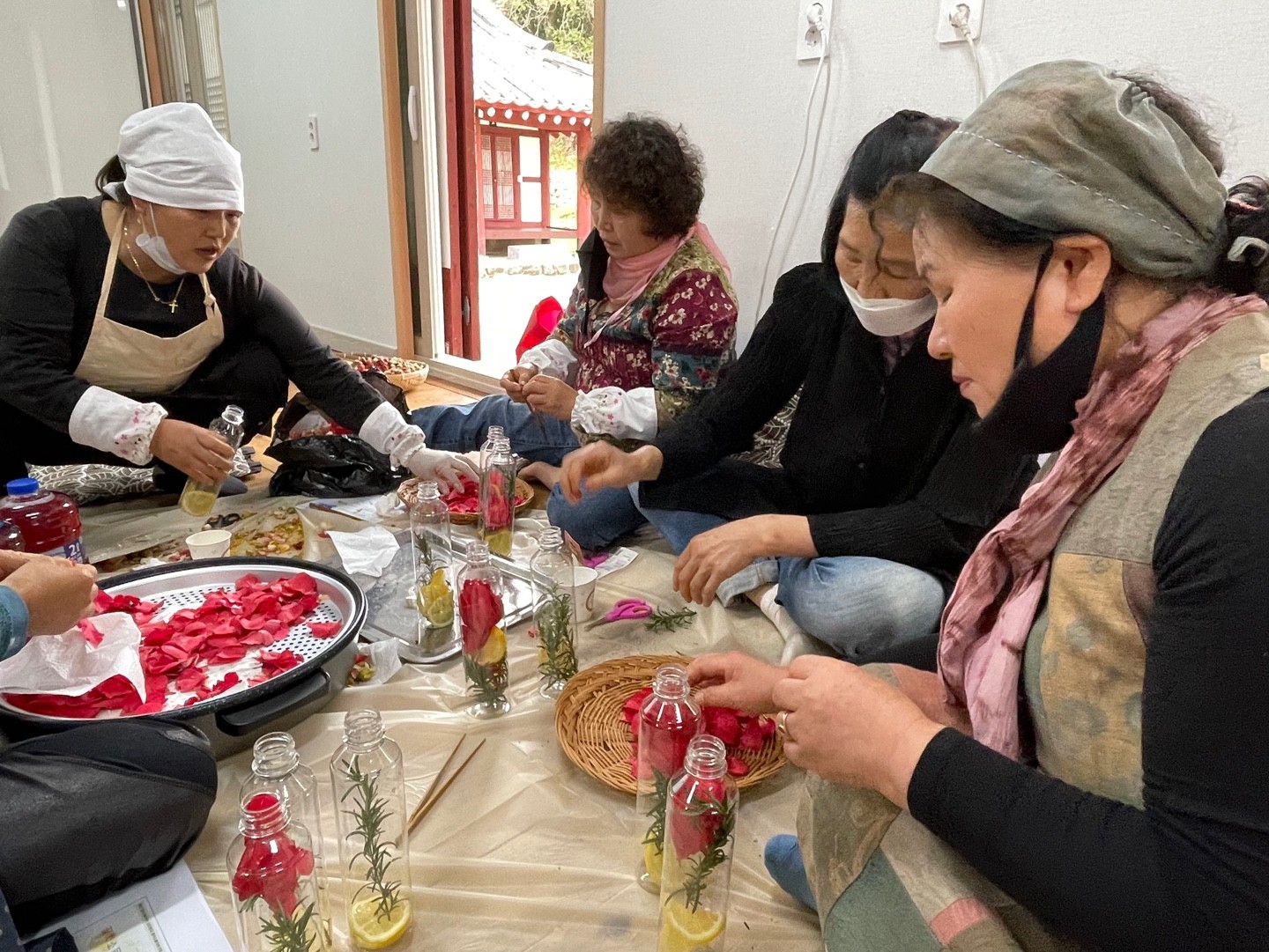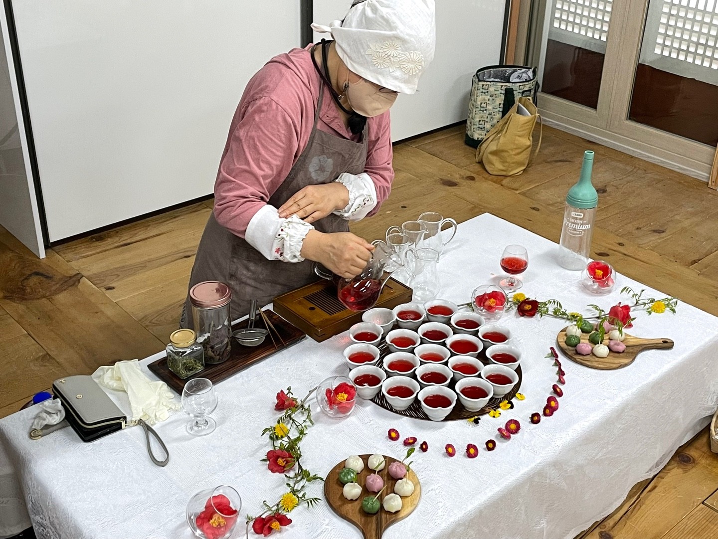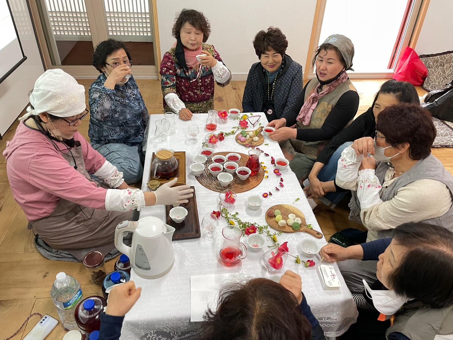 함께 모여 다과를 나누며 꽃차에 대한 이야기도 하고요