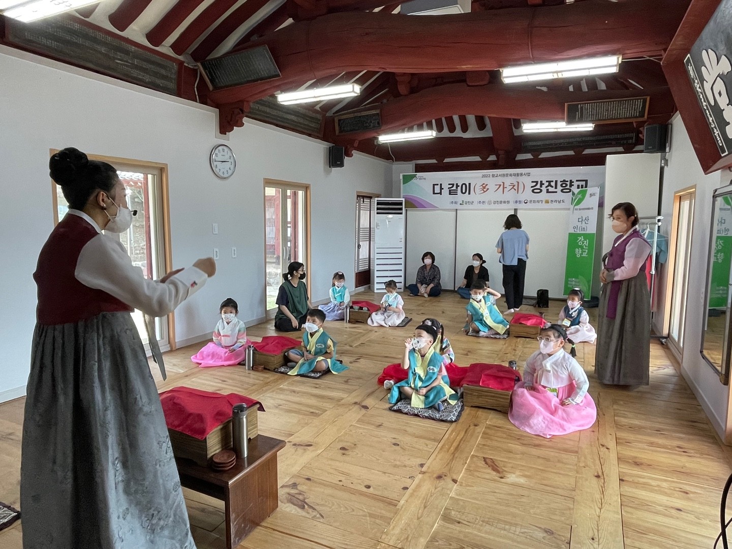 앞에서 다례 선생님께서 설명해주시면 친구들이 선생님의 말씀을 잘 귀담아듣고